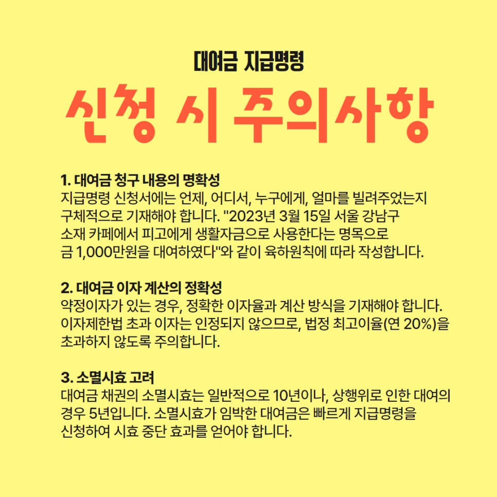 소멸시효가 임박한 대여금은 빠르게 지급명령을 신청하여 시효 중단 효과를 얻어야 합니다.