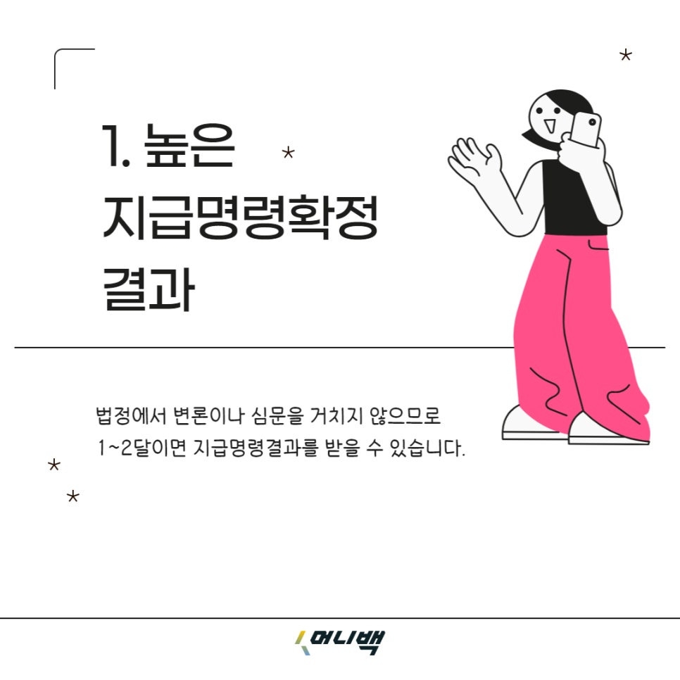 법정에서 변론이나 심문을 거치지 않으므로 1~2달이면 지급명령결과를 받을 수 있습니다.
