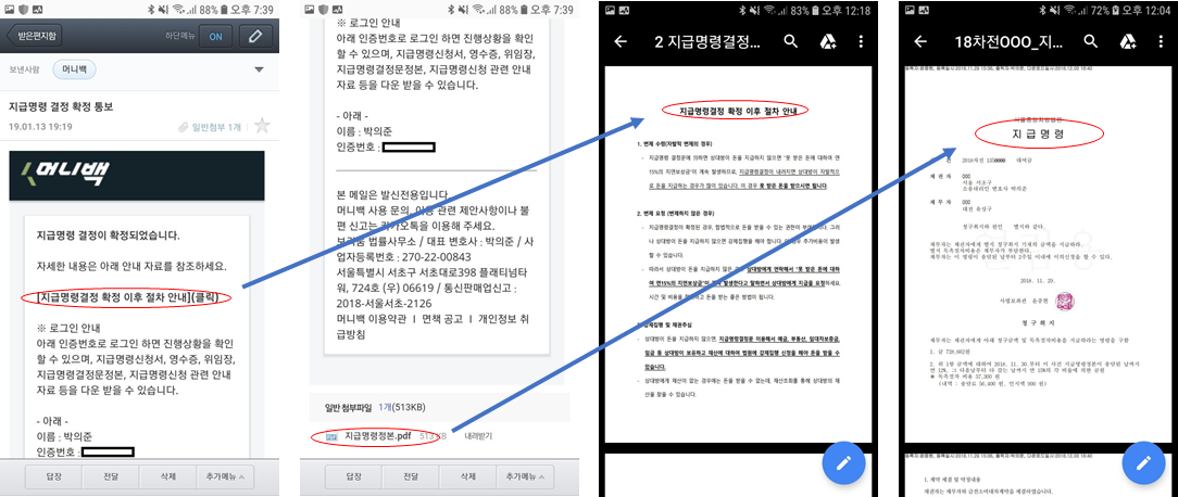 - 이메일에는 머니백 사용 및 사건(지급명령, 민사소송, 가압류) 절차 안내 문서를 보내드립니다. 결과 예측 소요 시간 등 자주하는 질문과 법원 절차에 대해 간단한 설명이 포함되어 있습니다.