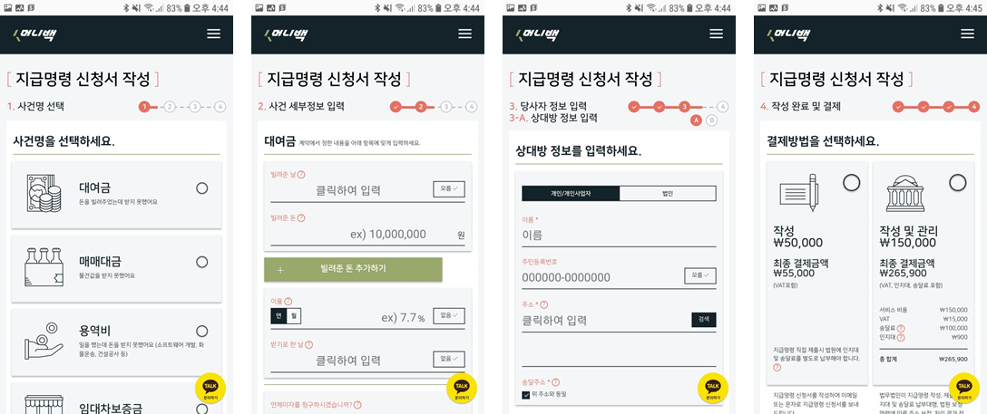 - 지급명령, 민사소송, 가압류 등 사건 정보를 입력한 후, 결제하시면 됩니다. 5분에서 10분정도 소요됩니다.