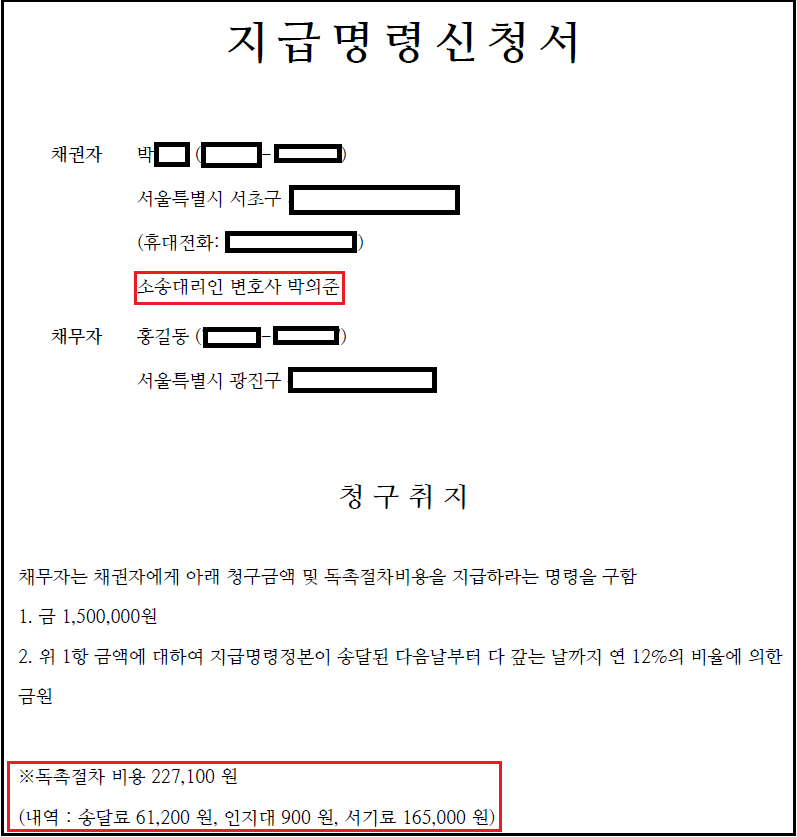 - 사건정보를 검토한 후, 신청서(지급명령신청서, 민사소송 소장, 가압류 신청서 등)가 작성되면 문자 및 이메일로 알려드립니다.