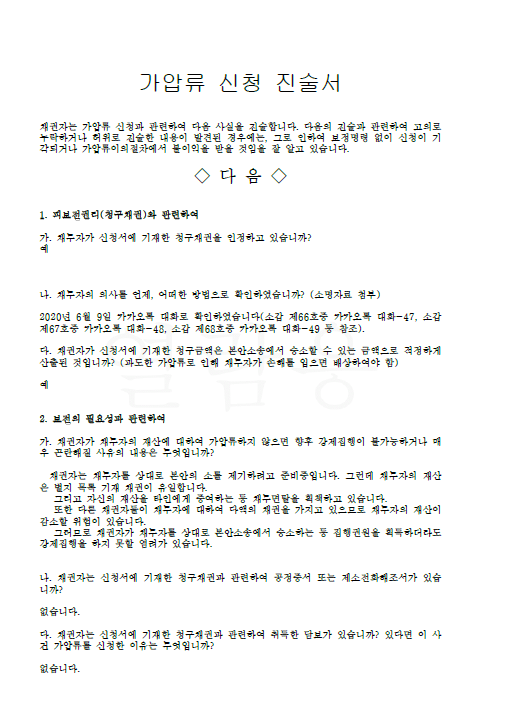 - 가압류 신청서 작성 후, 본 사건에서 특별한 수정요청사항이 없어서 작성된 문서 그대로 법원에 제출하였습니다.