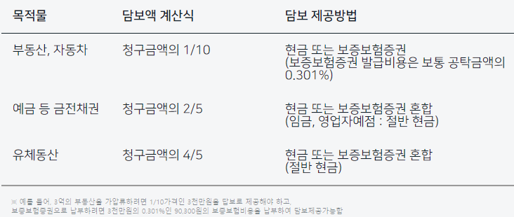 - 담보제공명령은 담보로 납부할 금액에 대해서 보증보험 또는 현금으로 공탁할 것을 명합니다.