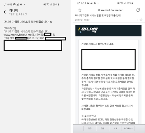 머니백은 가압류 결정이 내려졌다는 문자 및 이메일을 사용자에게 보냅니다.