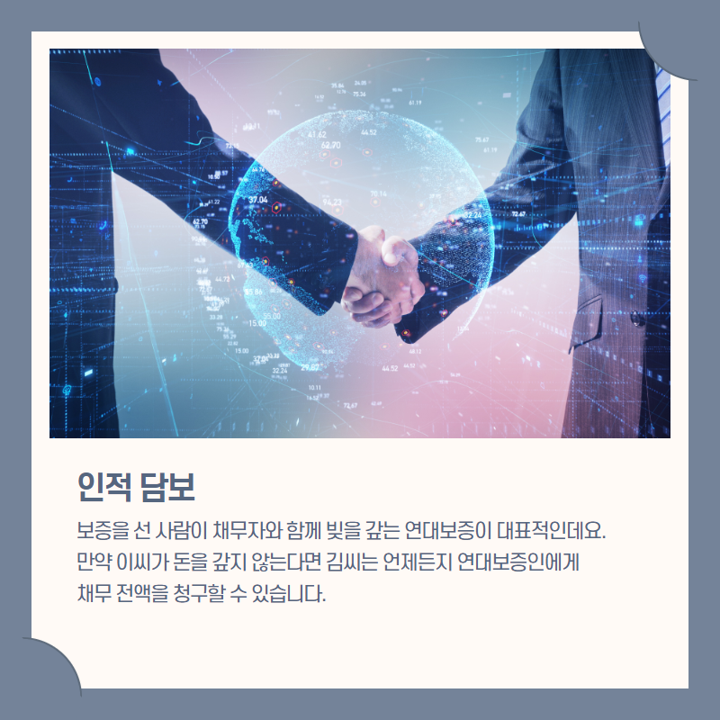 김씨가 요구한 것이 바로 ‘인적 담보’인 것입니다. 보증을 선 사람이 채무자와 함께 빚을 갚는 연대보증이 대표적인데요. 만약 이씨가 돈을 갚지 않는다면 김씨는 언제든지 연대보증인에게 채무 전액을 청구할 수 있습니다.