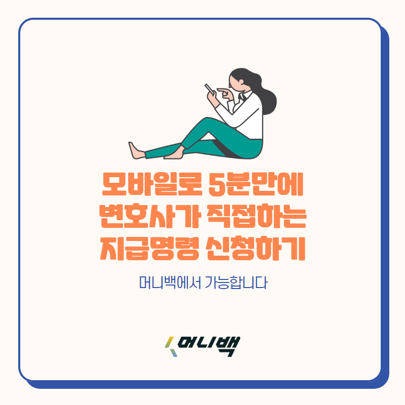 못 받은 돈을 받는 가장 저렴하고 쉬운 방법입니다. 자동화 시스템으로 원금과 이자까지 자동으로 계산해 드리며 전문 변호사가 여러분의 지급명령신청 절차를 꼼꼼하게 진행합니다. 못 받은 돈, 애타하지 말고 이제 머니백과 함께 하세요.
