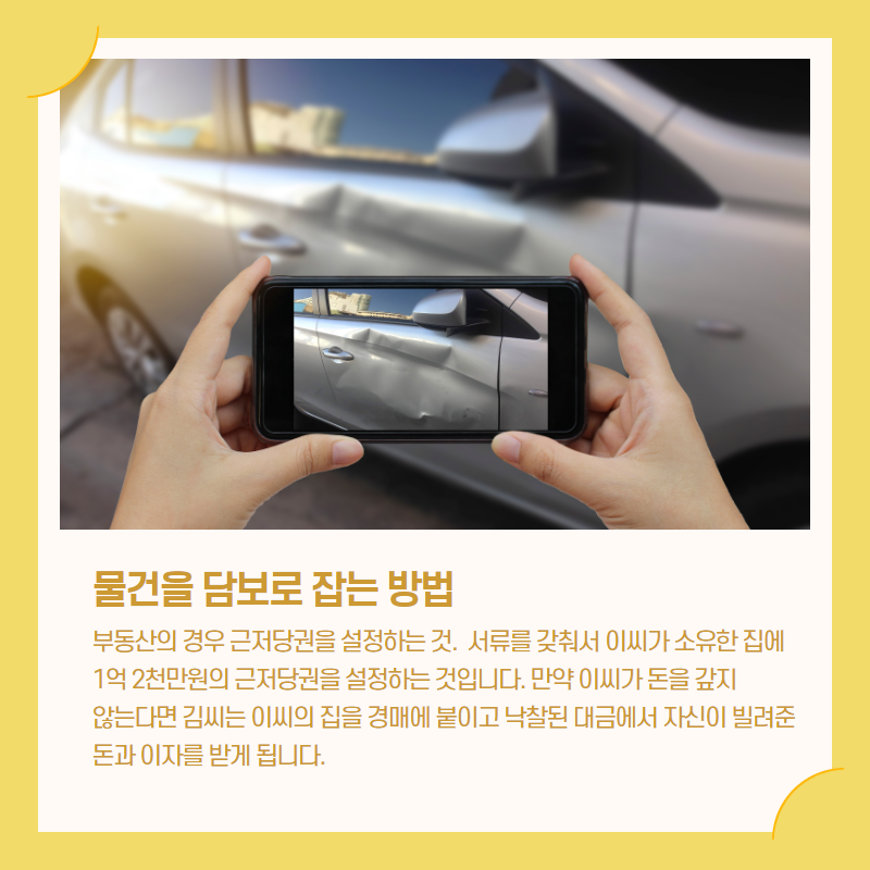 별별 사정으로 돈을 못 받게 되었을 때 설정하는 것입니다. 상대방에게서 제공받는 담보는 사람과 물건 두 가지입니다.