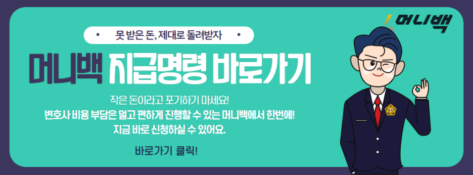 법원에 이 모든 절차를 밟기 위해서 개인이 직접 발로 뛰는 경우도 있지만, 실제로 법원의 반려를 받는 케이스가 상당히 많습니다. 그만큼 법적인 지식이 있어야만 수월하다는 뜻입니다. 머니백은 온라인으로 신청하는 법률 서비스입니다. 온라인으로 신청하고 결제만 하면 변호사가 직접 사건을 맡아 진행합니다.