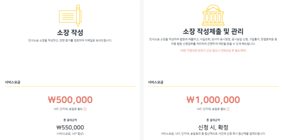 소장만 작성하여 검토하고 보내드리는 소장 작성 서비스 (50만원 세금별도) 와 재판 출석 이외에 모든 것을 처리해주는 소장작성 제출 관리 서비스 (100만원 세금별도) 중 하나를 선택할 수 있습니다. 소장 작성은 서류 외에 나머지를 신청자가 직접 해야 하기 때문에 대부분 소장작성 제출 관리서비스를 이용하십니다.