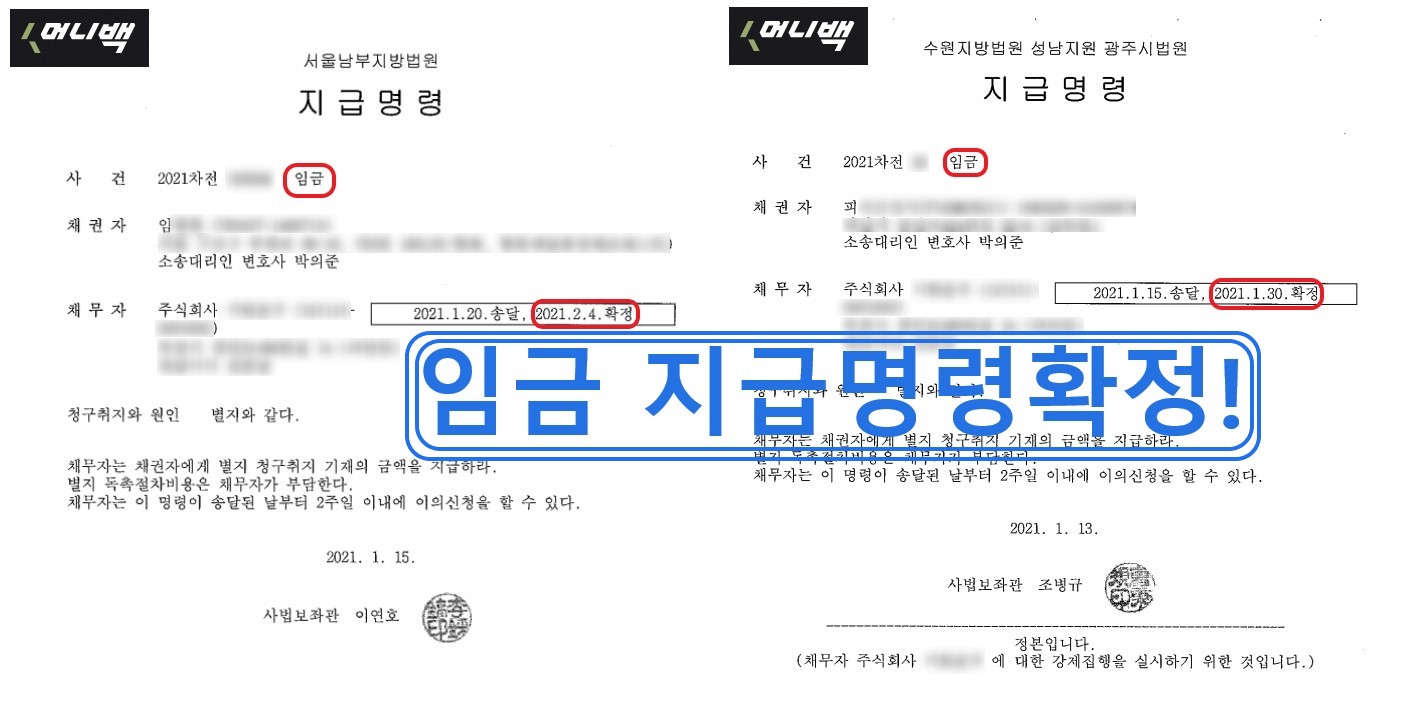 2021년 1월 초, 이 업체의 직원들은 머니백과의 상담을 통해 저희 머니백에 지급명령신청을 하였고, 빠르게는 2월 나머지 분들은 3월초 안에 모두 지급명령결정이 확정되었습니다. 검토과정에서 안타까운 마음이 컸던 만큼 지급명령확정 소식에 저희 머니백 직원들은 매우 기쁘고 뿌듯했었습니다. 그리고 확인결과 지급명령확정 전후에 모두 체불임금 및 퇴직금을 받았다고 합니다.