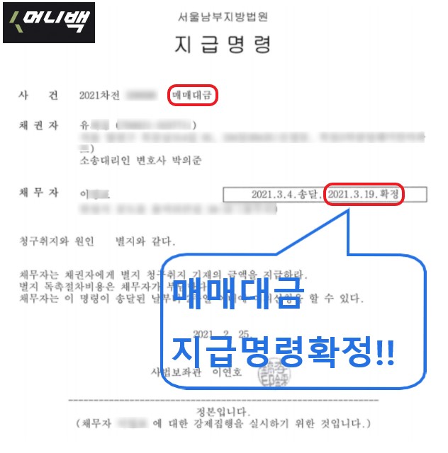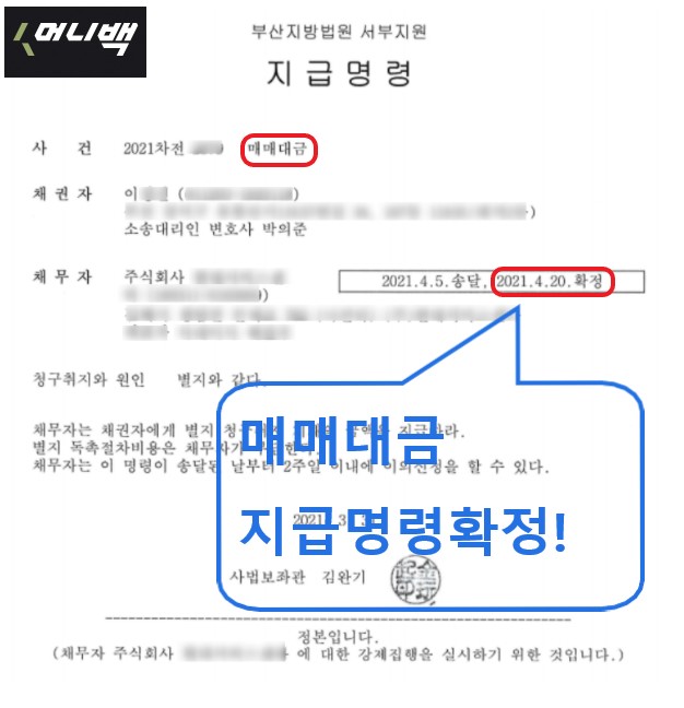 정당하게 받아야 할 매매대금을 받지 못하고 계신 분들이 있으시다면 지금 바로 주저하지 마시고 저희 머니백 지급명령을 신청하세요.
