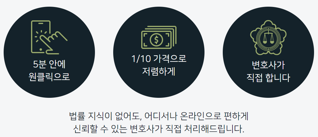 1) 클릭만으로 10분이면 신청가능하고, 2) 기존가격에 비해 1/5 가격으로 저렴하며, 3) 재판관련 업무를 One-Stop으로 해결해 드립니다.