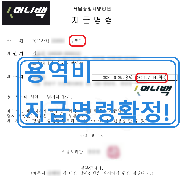 한달 후 2021년 7월 14일 용역비 지급명령결정이 확정되었습니다.