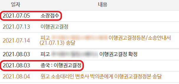 2021년 8월 소장 접수 후 29일만에 박씨는 이행권고결정정본을 받아볼 수 있었습니다.