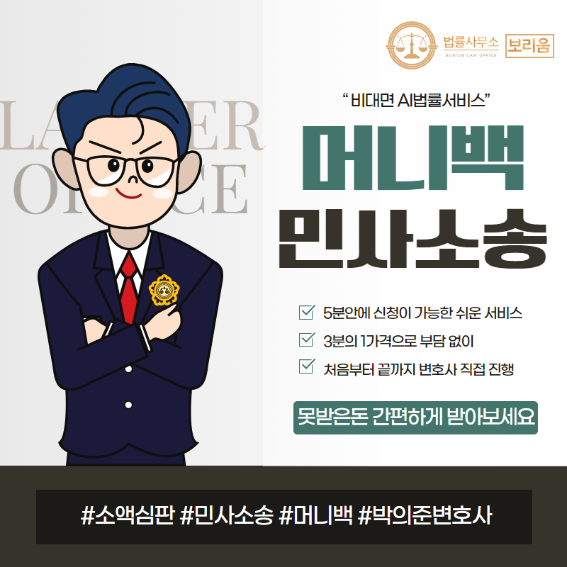 머니백 민사소송은 100만원으로 신청 가능하고, 머니백 사이트에서 진행상황을 실시간으로 확인하실 수 있습니다.