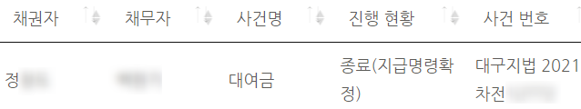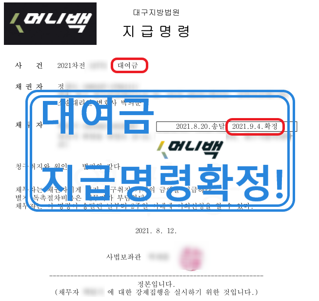 약 한달 후 2021년 9월 정씨의 머니백 대여금 지급명령결정이 확정되었습니다.
