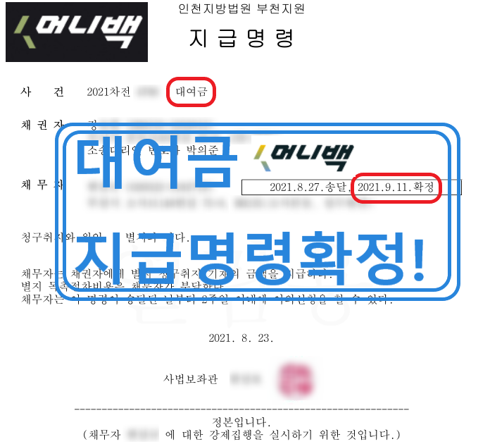 약 한달후인 2021년 9월 정씨의 머니백 대여금 지급명령결정이 확정되었습니다.