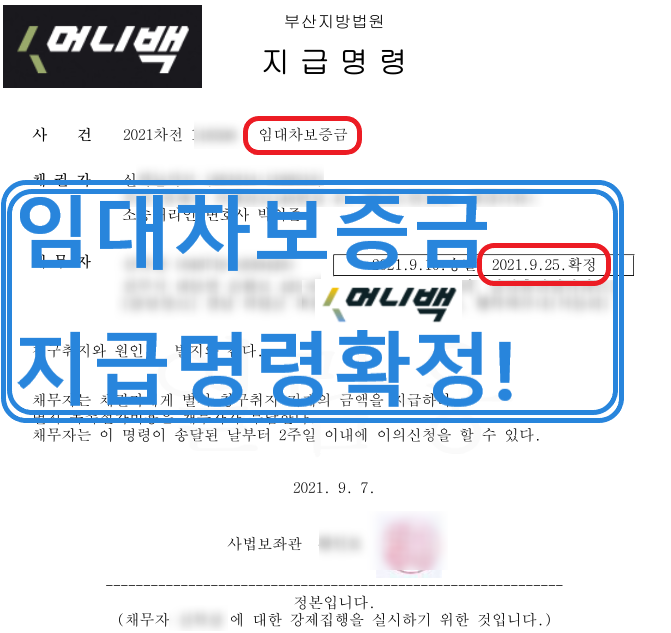 약 3주 후 2021년 9월 신씨의 임대차보증금 지급명령결정이 확정되었습니다.