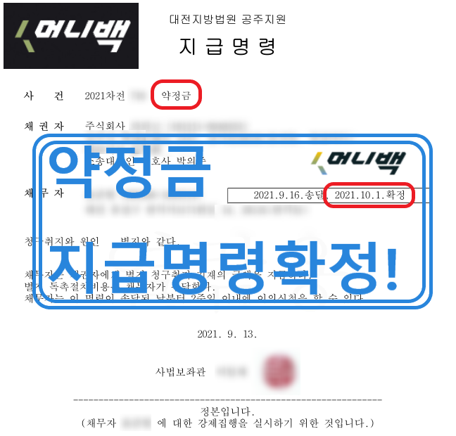 약 한달 후 2021년 10월 채권자 김씨의 머니백 약정금 지급명령결정이 확정되었습니다.