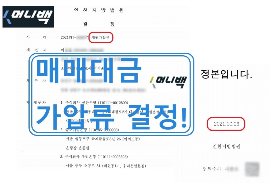 채권자 이씨는 채무자 김씨에게 중고차 1대를 매매하는 계약을 체결하고 계약금까지 받고 차를 내주었습니다. 일주일 안으로 나머지 잔금을 준다고 하여 일주일을 기다려주었지만 김씨에게는 아무소식이 없었습니다. 혹시 처음부터 줄 생각이 없었던 것은 아니었는지 불안해진 이씨는 지급명령신청과 함께 가압류 신청을 하기로 결심하였습니다. 김씨의 부동산에 대해서는 아는바가 없었기 때문에 김씨의 예금채권에 대해서 머니백 매매대금 채권 가압류 신청을 하였습니다. 그리고 2021년 10월 휴일 제외 4일만에 가압류결정정본을 받아볼 수 있었습니다.