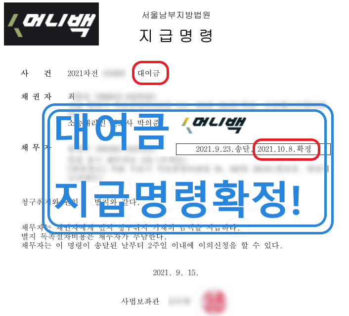 2021년 10월 최씨의 머니백 대여금 지급명령결정이 확정되었습니다.