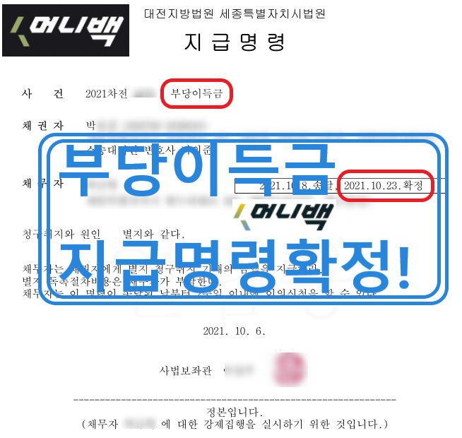 그리고 신청한지 3주만인 2021년 10월 23일 박씨의 지급명령결정이 확정되었습니다.