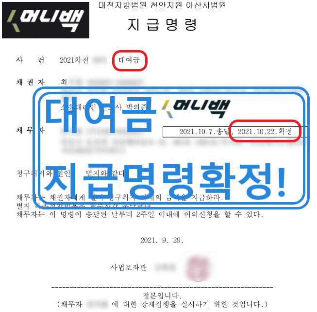 그리고 2021년 10월 최씨의 머니백 대여금 지급명령결정이 확정되었습니다.