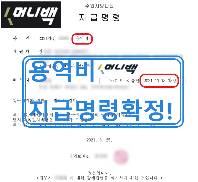 그리고 2021년 10월 장씨의 머니백 용역대금 지급명령결정이 확정되었습니다.