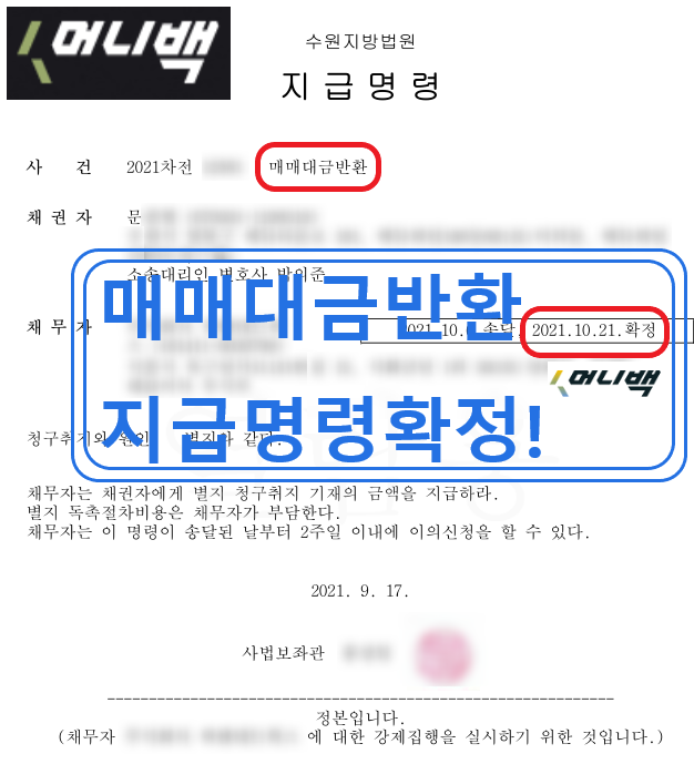 그리고 한 달 후 2021년 10월 머니백 물품대금반환 지급명령결정이 확정되었습니다.