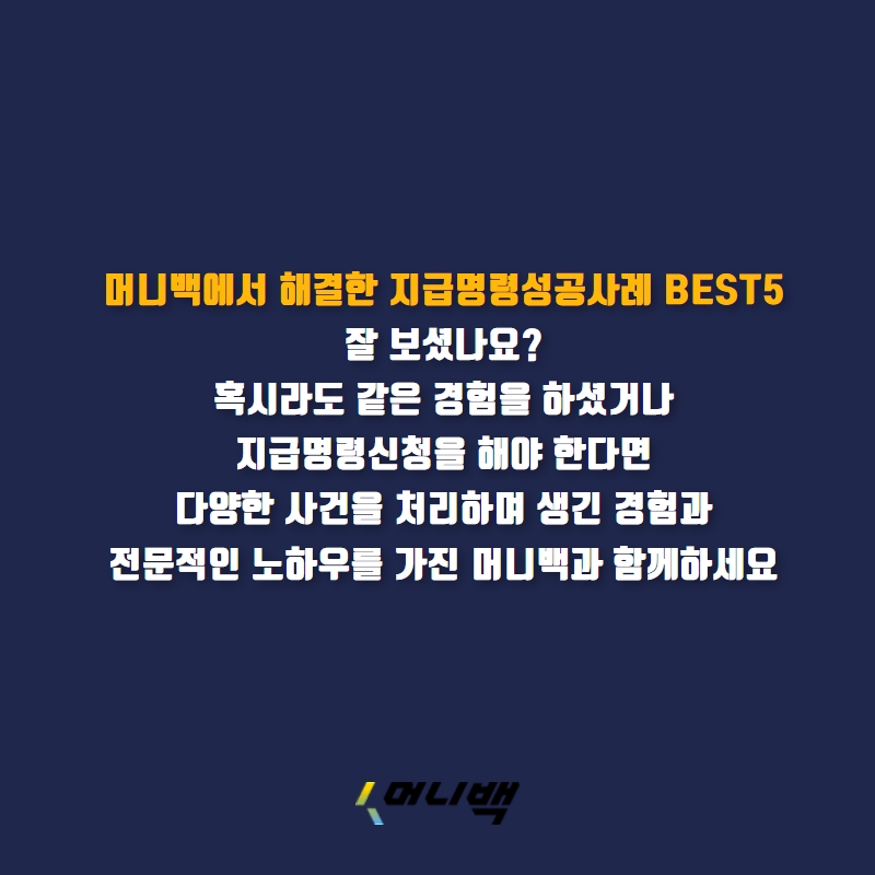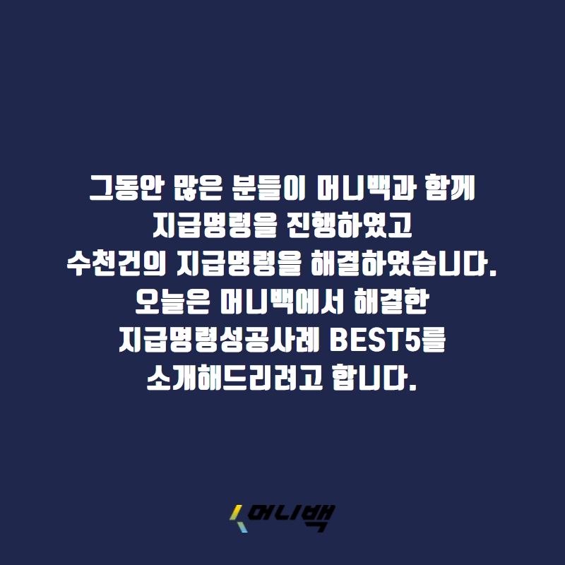 지금까지 머니백과 함께 진행하여 모두 지급명령신청이 성공한 사례 BEST 5를 함께 보았습니다. 잘 보셨나요? 혹시 이와 같은 경험이 있거나 지급명령신청을 해야 하는 상황이라면 주저하지 말고 머니백과 함께 해보세요. 다양한 사건을 처리하며 생긴 경험과 전문적인 노하우를 가진 머니백에서 도와드리겠습니다.
