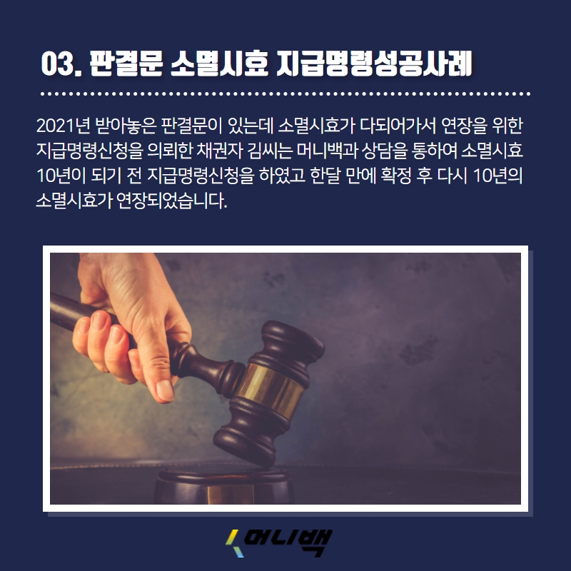 2021년, 받아놓은 판결문이 있지만 소멸시효가 다 되어가서 연장을 위한 지급명령신청을 의뢰한 채권자 김씨는 머니백과의 상담을 통하여 소멸시효가 10년이 되기 전 지급명령신청을 진행했습니다. 급박한 시간이었지만 머니백과 진행한 김씨는 한달 만에 지급명령결정이 확정이 되어 다시 10년의 소멸시효가 연장되었습니다.