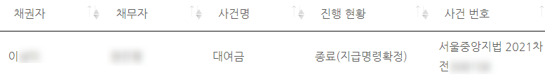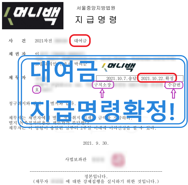 2021년 10월 이씨의 머니백 대여금 지급명령결정이 확정되었습니다.