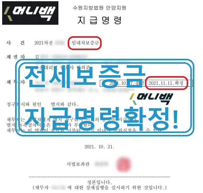 그리고 2021년 11월 김씨의 머니백 임대차보증금 지급명령결정이 확정되었습니다.
