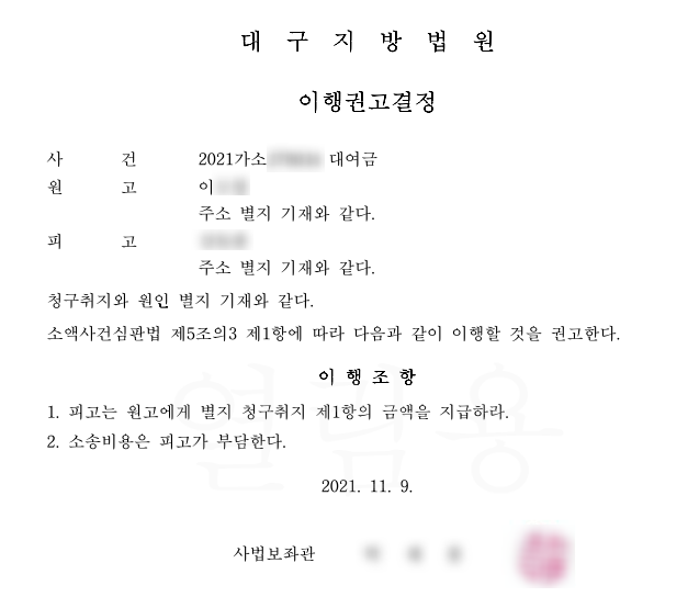 그리고 소장 제출 3주만에 이씨의 머니백 대여금 이행권고결정이 확정되었습니다.