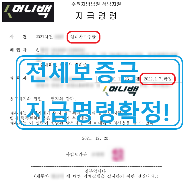 그리고 2022년 1월 3주만에 손씨의 머니백 전세보증금 지급명령결정이 확정되었습니다.