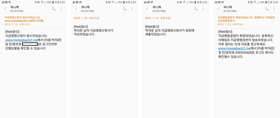 또한 머니백은 문자 및 이메일을 통해 인증번호로 로그인하면, 전체 진행상황을 보다 자세하게 알려드리며, 관련 문서도 언제든 다운받을 수 있도록 제공해드립니다. 인증번호로 로그인하고, 회원가입까지 하면, 머니백에서 신청한 모든 사건에 대해 실시간 진행상황 및 관련 문서를 데이터 베이스 형태로 보실 수 있습니다.