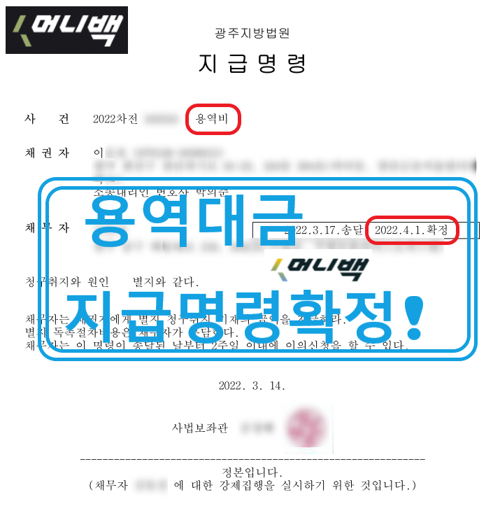 그리고 약 3주뒤, 2021년 4월 이씨의 머니백 용역대금 지급명령결정이 확정되었습니다.