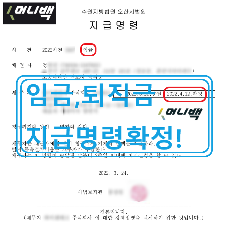 채권자인 정씨는 주식회사A에 다니고 있는 근로자였습니다. 2년동안 열심히 일을 하였고, 여러 사정상 퇴직을 하게 되었습니다. 그런데 정씨에게는 회사로부터 받지 못한 3달치의 밀린 임금이 있었습니다. 그래서 퇴직을 하며 체불임금 3개월치와 퇴직금을 함께 청구하였습니다. 못받은 돈은 총 3000만원 정도 였습니다. 회사측에서는 현재 상황이 넉넉하지 않으니 조금만 기다려 달라고 하였고, 정씨도 2년간 함께 해온 곳이었기 때문에 조금만 참고 더 기다려주기로 하였습니다. 그러나 1년이 지나도 돈은 들어오지 않았고, 결국 정씨는 2022년 3월 머니백에 지급명령신청을 하게 되었습니다.