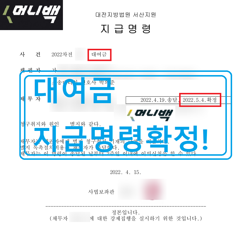 그리고 약 한 달 후 2022년 5월 가씨의 머니백 대여금 지급명령결정이 확정되었습니다.