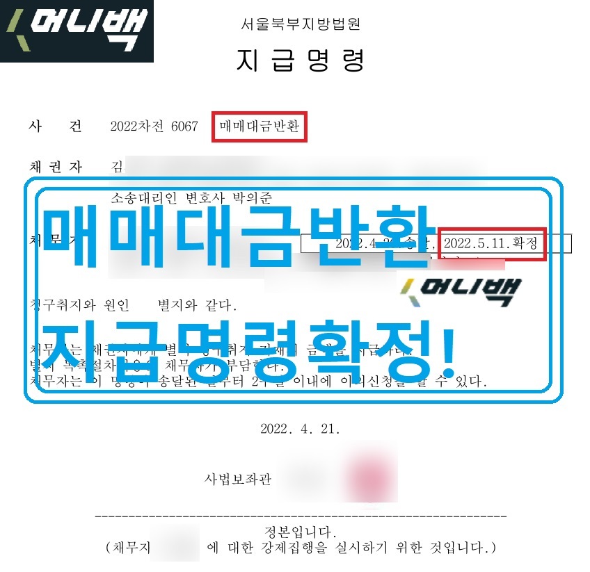 그리고 약 3주후 2022년 5월 김씨의 머니백 매매대금반환 지급명령결정이 확정되었습니다.