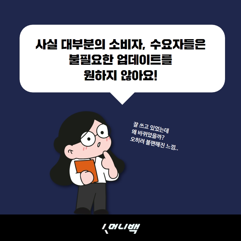 실제로 이용하는 서비스에 대한 불만의 60~70%가 업데이트에 대한 이야기였는데요. 업데이트 전 사용이 더 편했다거나 잘 쓰고 있는데 굳이 업데이트를 해야 할 필요가 있었는지에 대한 의문을 가지기도 합니다.