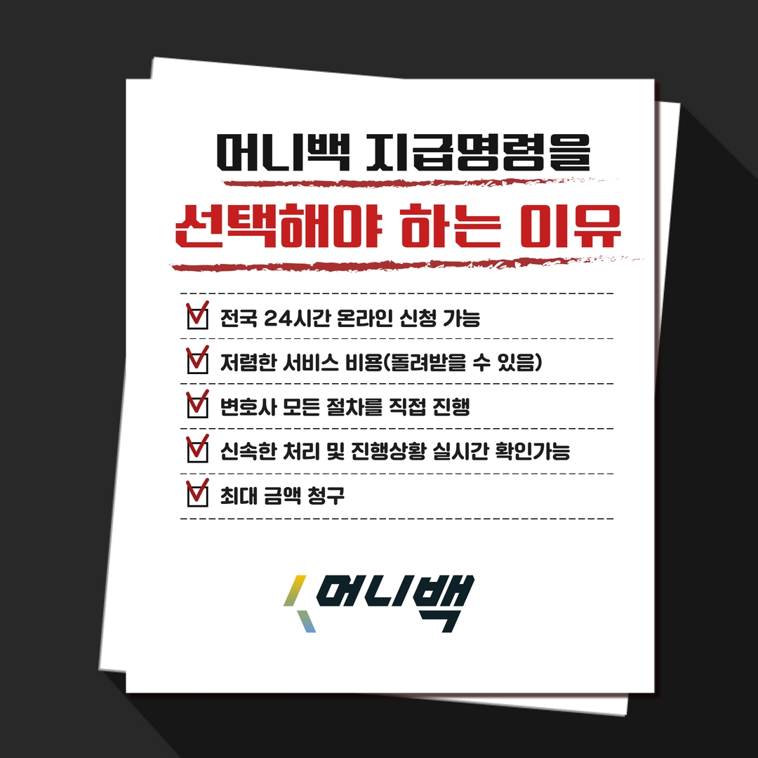이럴경우, 머니백 지급명령제도를 이용해보시는 것을 추천드립니다. 지급명령이란, 상대방에 자신의 채무를 인정하고 있다는 것을 전제로 하여 진행되는데 통상의 민사소송보다 사건진행이 빠르고 간편합니다. 또한 머니백을 통해 신청하면 15만원으로 사건진행을 할 수 있기 때문에 매우 저렴합니다. 더구나 지급명령결정이 확정되면 그 효력은 민사소송의 승소판결문과 동일합니다.