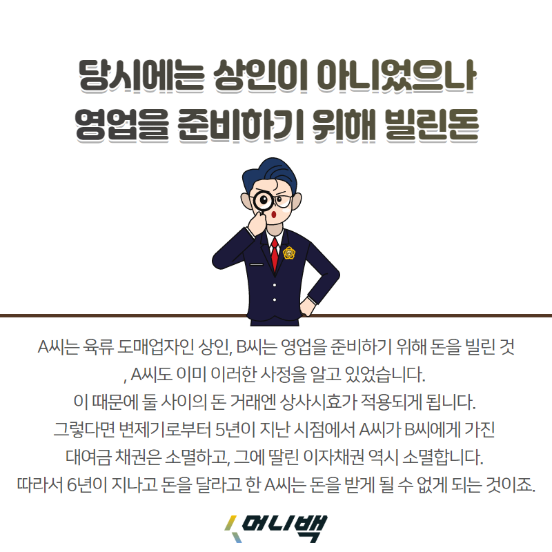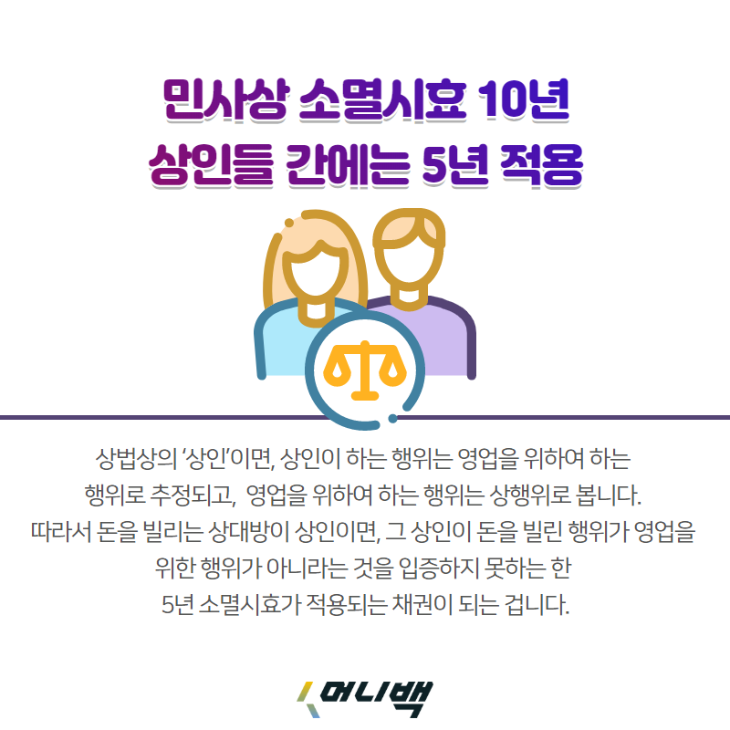 민법상 소멸시효는 10년으로 규정돼 있지만, 상인들 사이에서는 5년의 소멸시효가 적용됩니다. 상법상의 ‘상인’이면, 상인이 하는 행위는 영업을 위하여 하는 행위로 추정되고, 영업을 위하여 하는 행위는 상행위로 봅니다. 따라서 돈을 빌리는 상대방이 상인이면, 그 상인이 돈을 빌린 행위가 영업을 위한 행위가 아니라는 것을 입증하지 못하는 한 5년 소멸시효가 적용되는 채권이 되는 겁니다.