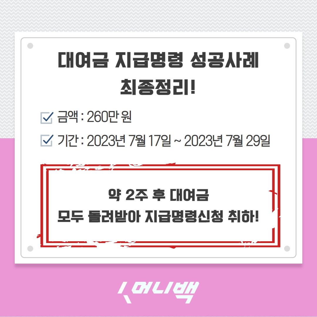 | [성공사례] 머니백 대여금 지급명령신청 성공 후기 (0) | 2023.07.07 |