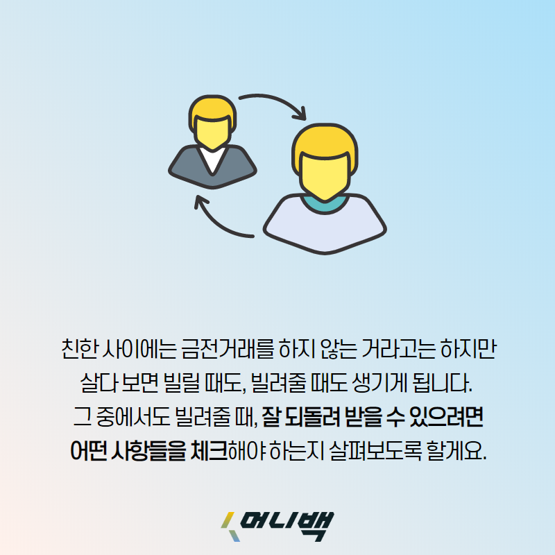 하지만 살다보면 돈을 빌릴 일도, 빌려줄 일도 생깁니다. 대부분 카톡이나 전화통화, 아니면 직접 만나서 돈을 빌려달라는 얘기를 듣게 되는데요. 돈을 빌려준다고 마음을 정했다고 하더라도 잘 빌려주고 돌려 받기 위해서 무엇을 체크해야 하는지 알아봅니다.