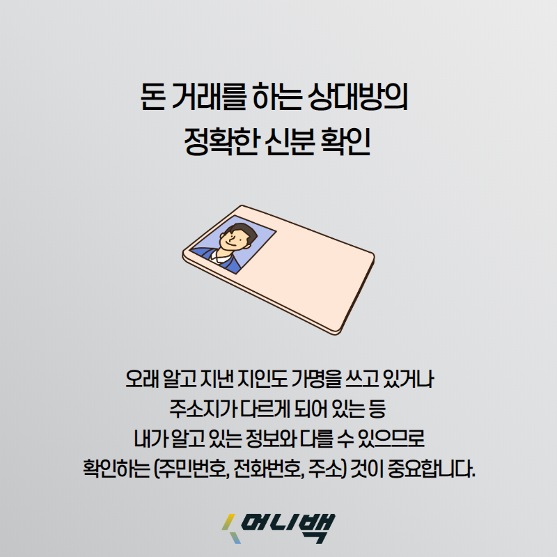 먼저 돈 거래를 하는 상대의 신분을 확인하는 게 중요합니다. 10년 전부터 알고 있던 지인이라도 알고보니 가명이라거나, 주소지가 다르게 돼 있거나, 국적이 다르거나 할 수도 있습니다. 원래부터 알고 있는 사람이라고 해도 다시 한 번 확인하세요.