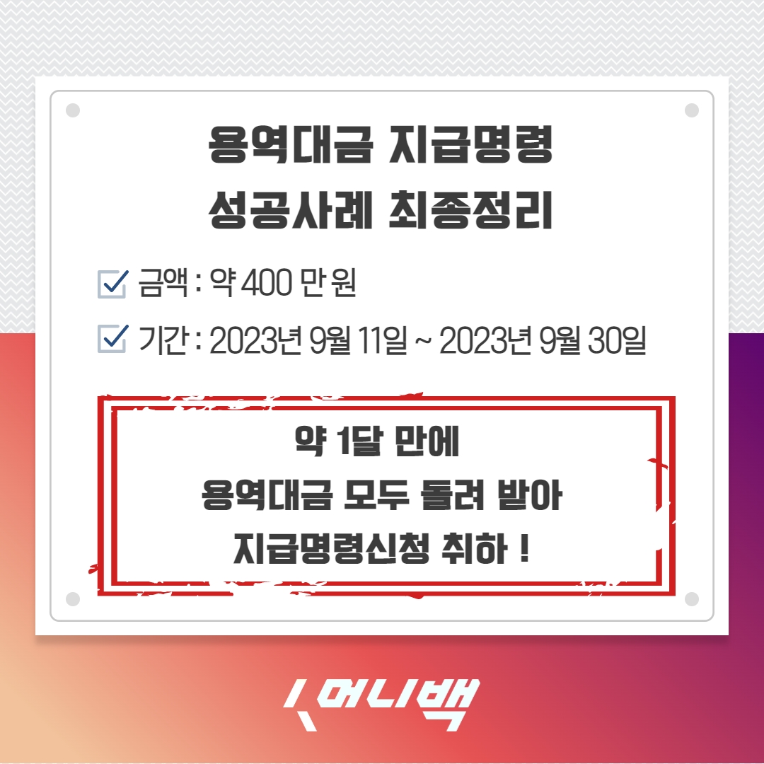 | [성공사례] 머니백 오픈마켓 용역비 지급명령 신청 후 돌려받은 후기 (0) | 2023.11.10 |