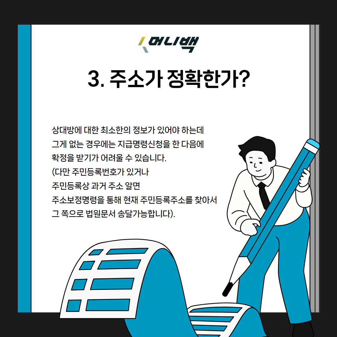상대방에 대한 최소한의 정보가 있어야 하는데 그게 없는 경우에는 지급명령신청을 한 다음에