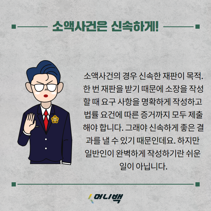 소액사건의 경우 신속한 재판을 목적으로 합니다. 한 번 재판을 받기 때문에 소장을 작성할 때 요구 사항을 명확하게 작성하고 법률 요건에 따른 증거까지 모두 제출해야 합니다. 그래야 신속하게 좋은 결과를 낼 수 있기 때문인데요. 하지만 일반인이 완벽하게 작성하기란 쉬운 일이 아닙니다.