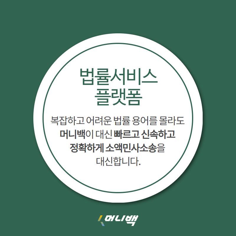 머니백은 빌려준 돈, 매매대금, 용역비, 임대차보증금 등 떼인돈이 있다면 소액 민사소송을 통해 간편하게 처리합니다. 복잡하고 어려운 법률 용어를 몰라도 머니백이 대신 빠르고 신속하고 정확하게 소액민사소송을 대신합니다. 보통 2~3개월 안에 법원 판결을 받을 수 있고 상대방에게 전달되면 89%의 비율로 승소 판결을 받을 수 있어요. 이제 떼인돈 속 끓이지 마시고 머니백과 함께 하세요.
